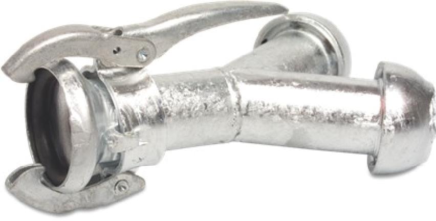 Female coupling with hose pipe and locking bracket. Galvanized steel.