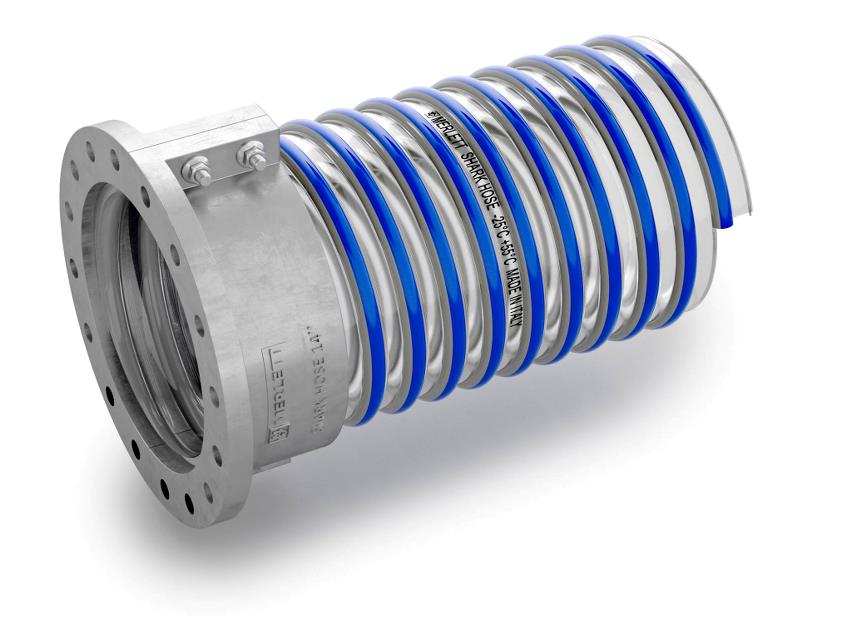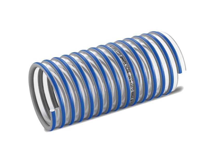 Shark hose. 8"/Ø203mm. Transparent PVC hose w/ blue PVC Spiral.