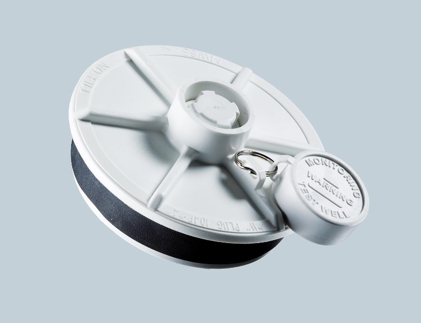 Locking monitoring well expansion plug with male poppit and dust cap.