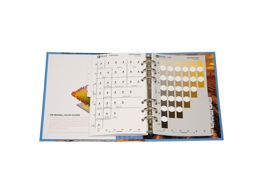 Soil colour book (Munsell) with 12 colour charts (5R/7.5R/10R/2.5YR/5YR/7.5YR/10YR/ 2.5Y/5Y/10Y-5GY/GLEY 1 and Gley 2) and 1 white chart. Water-resistant, washable pages, American version.